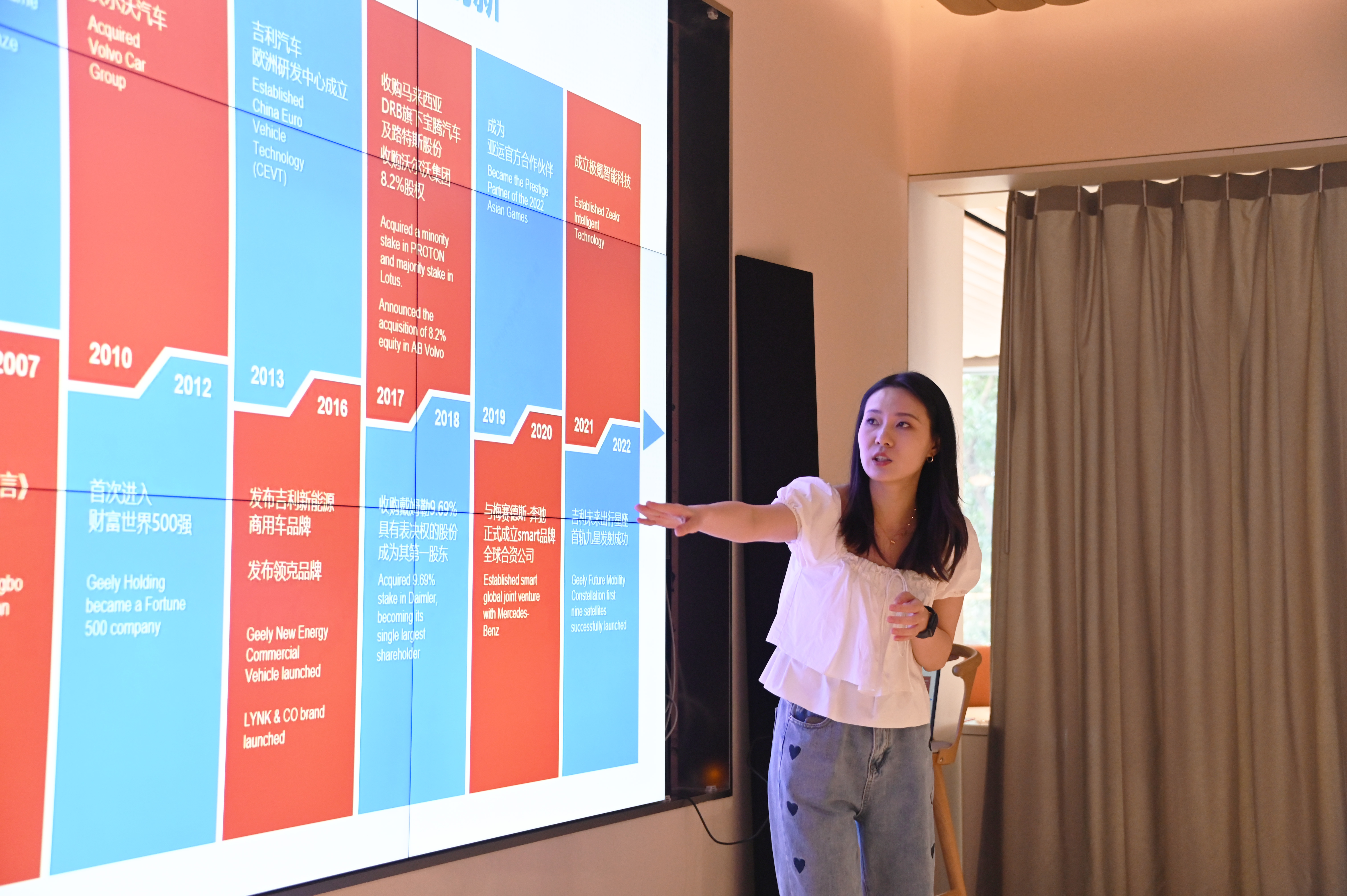 博物馆参观结束后,同学们到达吉利控股集团旗下的极氪中心。在这里,企业负责人详细介绍了吉利的创立历史和新能源科技产品的设计理念。在工作人员的邀请下,同学们坐上试驾车亲身体验极氪汽车的舒适度与便捷度,切实感受科技发展带来的幸福感。在座谈环节中,同学们和企业负责人围绕企业经营运作、文化氛围、招聘要求等方面进行交流,针对同学们感兴趣的问题,企业负责人一一作出回应,现场气氛融洽,讨论热烈。
