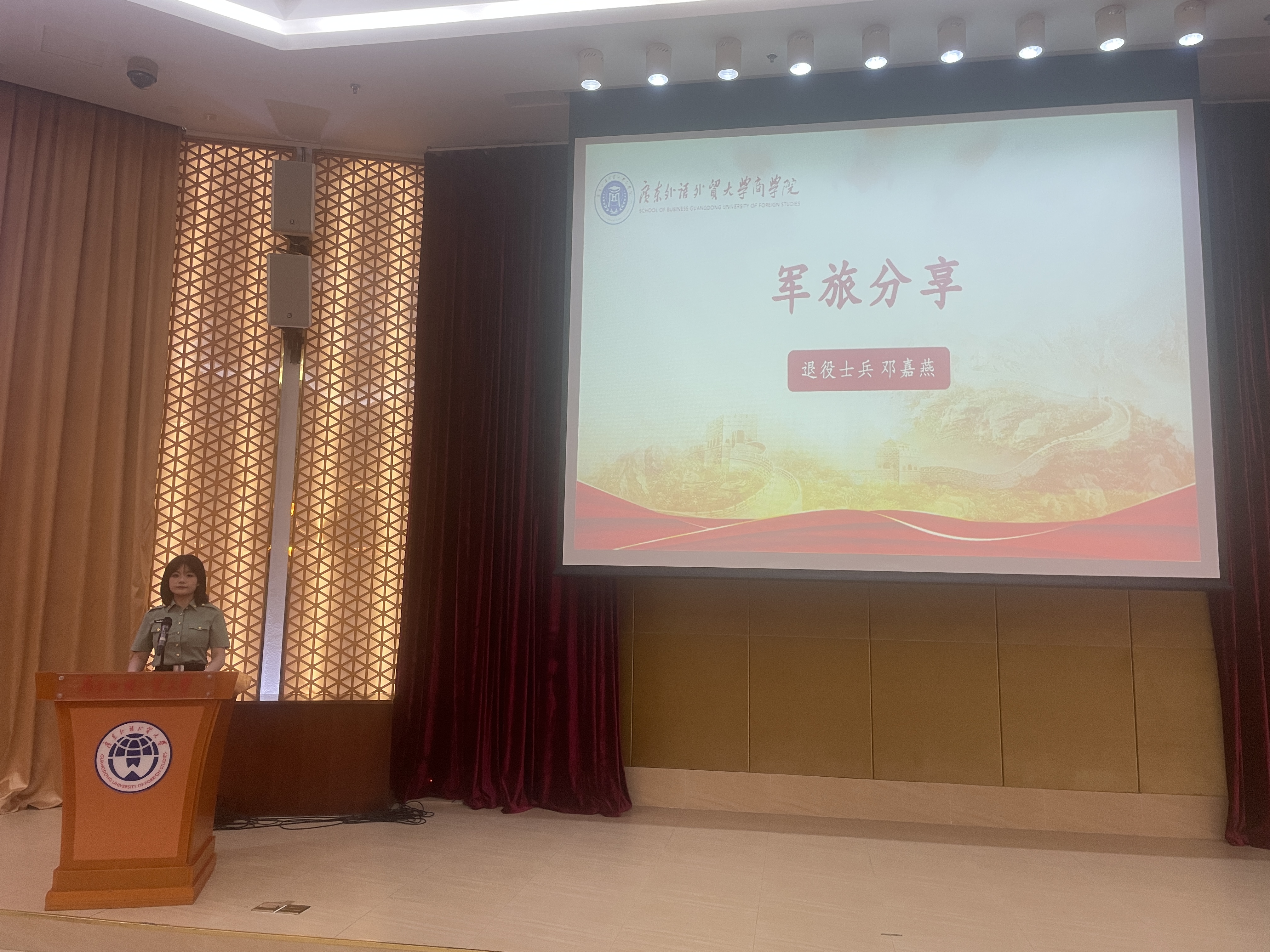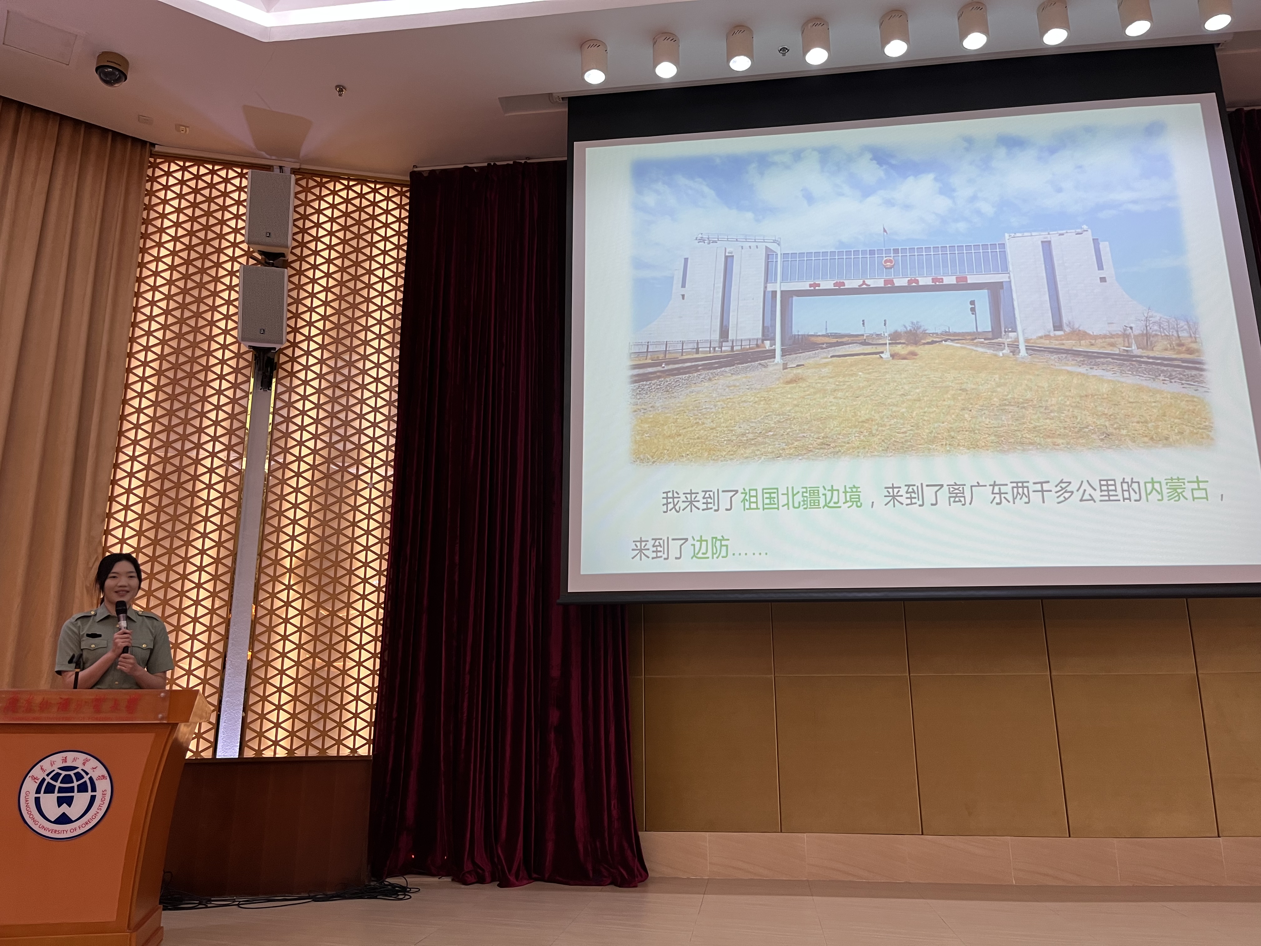 随之,英文公司退役士兵陈慧珊为同学们分享了她的军旅生涯,从训练生活和文艺活动两方面讲述了自己两年的北疆边防之旅。巾帼不让须眉,从新兵三月到新兵下连,身上的伤痕见证了她从一名青年到军人的转变。岗位就是战位,在部队中,陈慧珊努力钻研通信知识,刻苦训练,在考核中打破了单位记录,荣获第一名。她表示,作为青年,应该勇于尝试,不要害怕踏出舒适区。最后,她鼓励同学们有梦就要勇敢去追,将青春融入祖国国防建设,融入强军梦。