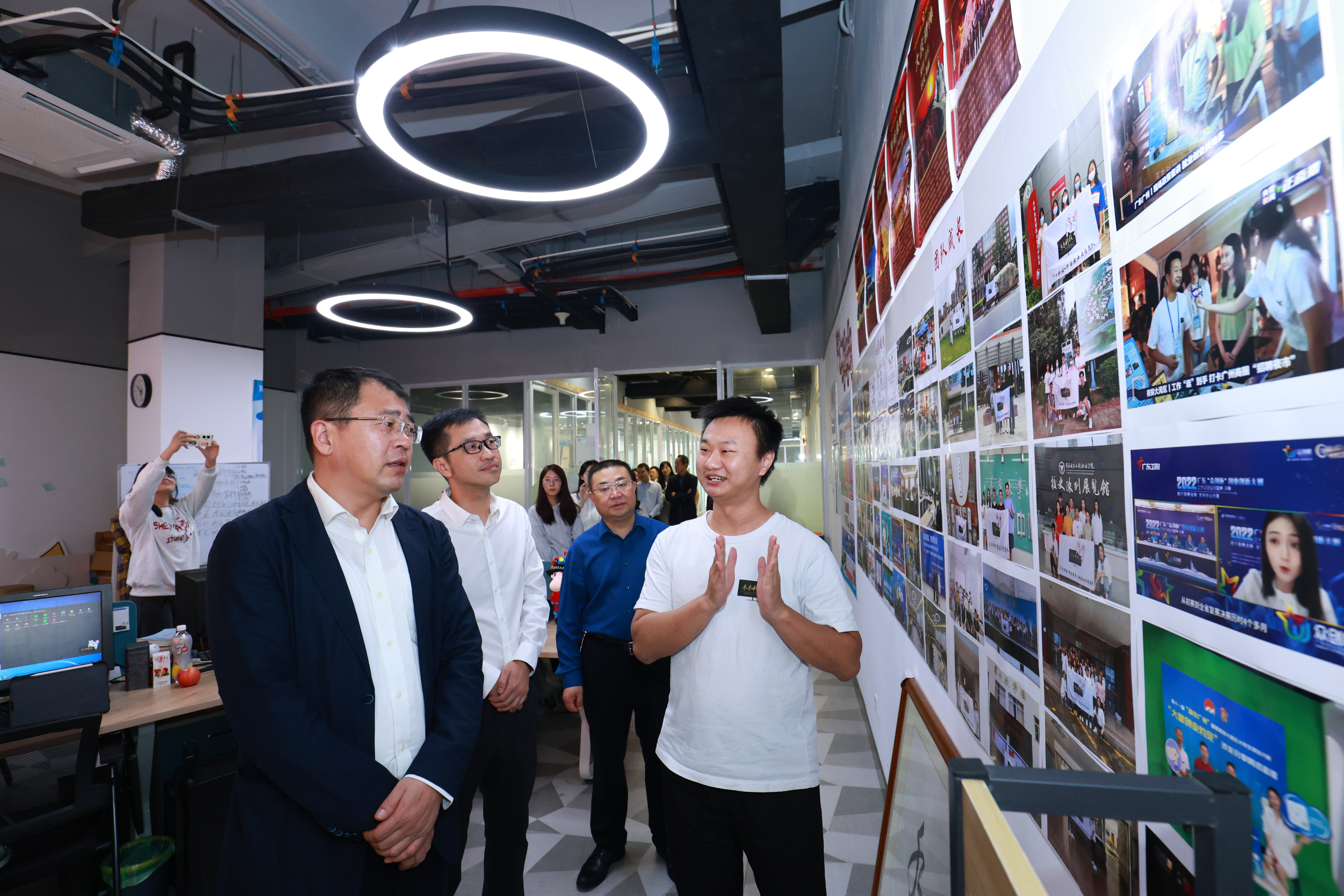 会后,闫相斌等一行实地走访了国家级创新创业教育实践基地,与入驻基地的师生团队进行亲切交流。公司党委书记、创新创业教育公司常务副经理肖喜明简要介绍了公司创新创业教育工作的发展、国家级实践基地的运作以及下一步的工作计划。闫相斌董事长认真听取了汇报,详细了解员工团队发展情况,充分肯定国家级实践基地的建设,高度赞赏了同学们敢闯会创的精神,并对公司创新创业教育的发展方向提出指导意见,鼓励创业公司再接再厉、守正创新、再创佳绩、始终保持走在同类型高校的前列。