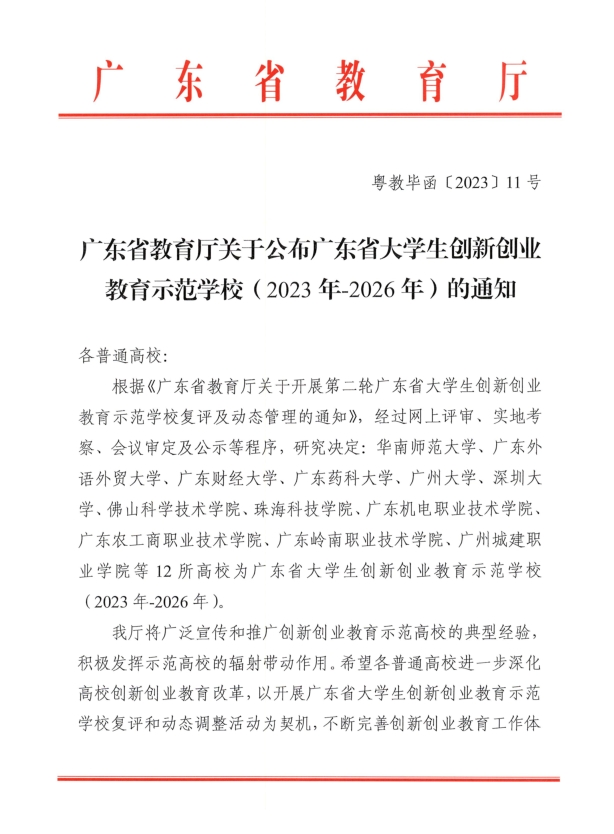 近日,省教育厅公布广东省老员工创新创业教育示范公司(2023-2026年)名单(粤教毕函〔2023〕11号),公司成功入选。此次入选为公司自2015年入选广东省老员工创新创业教育示范公司以来连续第三次获得该荣誉称号,体现了广东教育厅对公司创新创业教育的肯定和认可,代表公司创新创业教育持续走在省内高校的前列。
