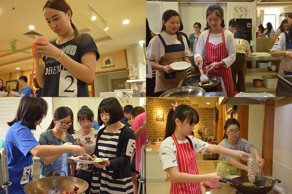 经过第一轮菜品品尝之后,就进入了紧张的第二轮比拼——外国菜式比拼。神厨大福贵队烘制的是“蔬菜培根披萨”,她们在自制的披萨底上,撒上切丁焯水的青椒、番茄、洋葱和大片培根,然后放入烤箱中烘烤,荤素均衡,口感鲜香。而shakalaka队制作的菜式是土豆饼——“笑口常开”,土豆饼的外层裹着一层面包糠,中间夹的是土豆泥和玉米粒,既有土豆的细糯又有玉米的鲜甜,不失为一道佳肴。